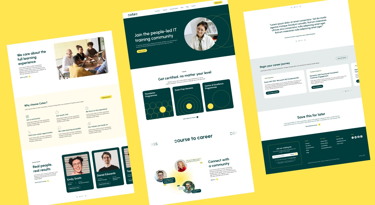 The initial colour palette started with a rich purple but evolved with collaboration into vibrant shades of green and yellow, creating a visual identity that felt fresh and energetic. The sleek yet inviting design perfectly mirrored Cotec’s forward-thinking vision whilst keeping it linked to its community-driven approach.