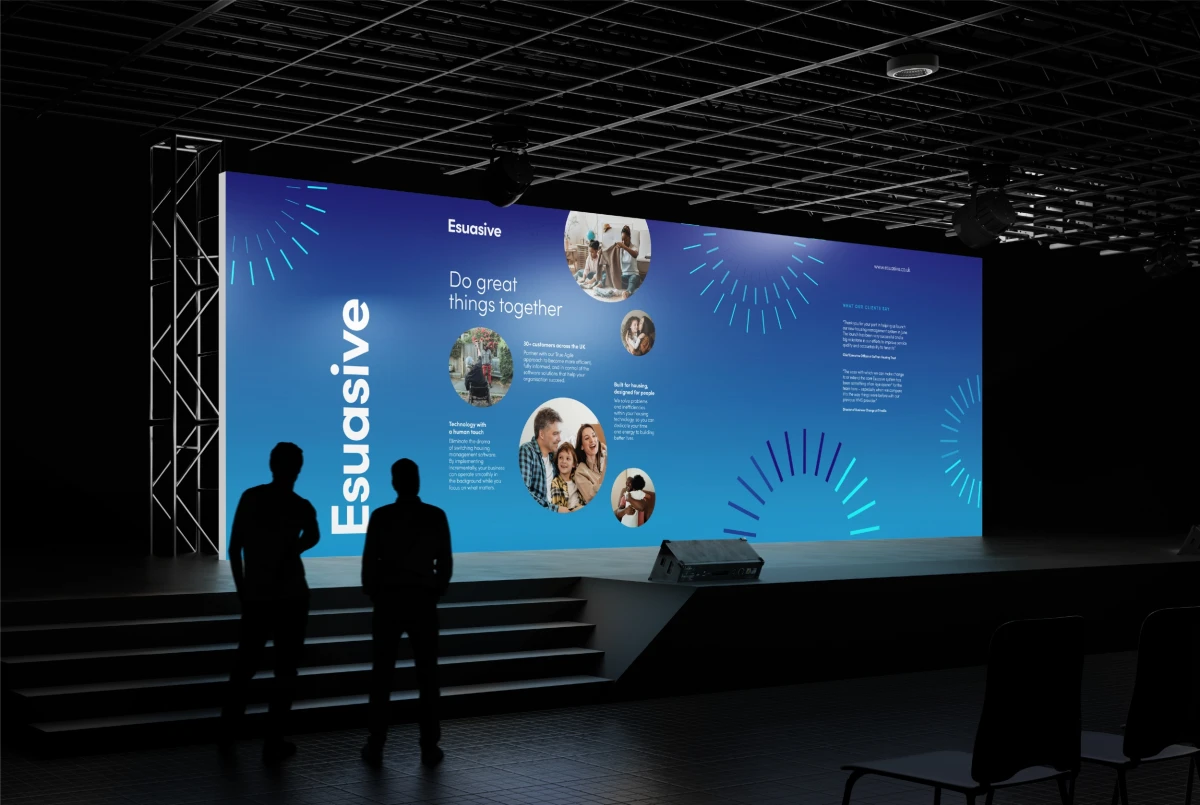Alongside the creation of the website and brand, JUMP’s design team engaged with Esuasive to design an expo stand for them to showcase at Housing Technology 2025. The design was carefully planned to complement the space, ensuring the prominence of important messaging around speed of delivery and specific functionality.